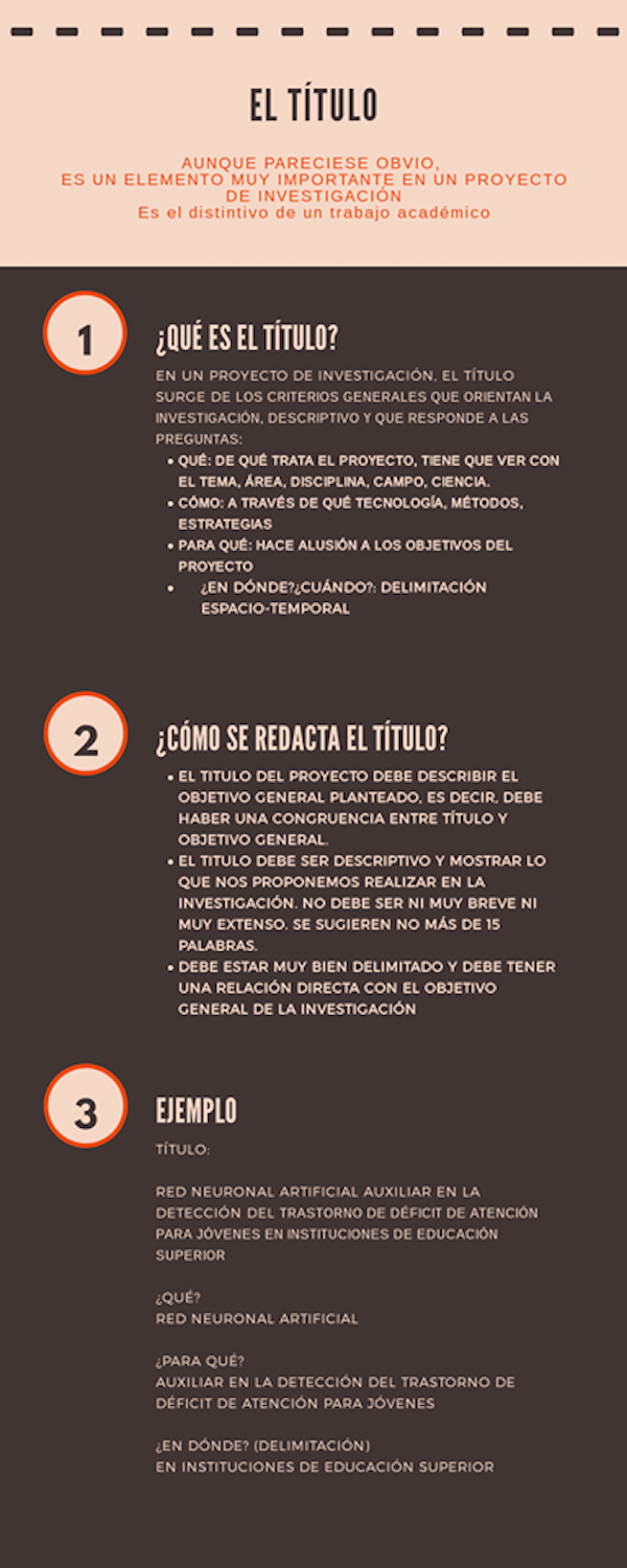 | El titulo del proyecto es prácticamente lo último que se ajusta. Ya que al momento de que nuestro proyecto no requiera mas ajustes, entonces el título que resulte de ese ultimo ajuste será el último Debe reflejar brevemente el QUÉ, el CÓMO y el pARA QUÉ |